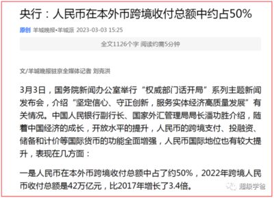 前几天我注意到一个数据,人民币在本外币跨境收付总额中占了约50%,2022年跨境人民币收付总额是42万亿元,比2017年增长了3.4倍。