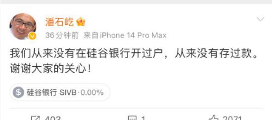 前天国内不是有不少自媒体称潘石屹在硅谷银行存了数亿美元嘛,昨天潘石屹突然在其已经很久不更新的国内社交媒体微博上发声,还真的出来“辟谣”了,说他从来没在硅谷银行开过户,从来没有存过款。