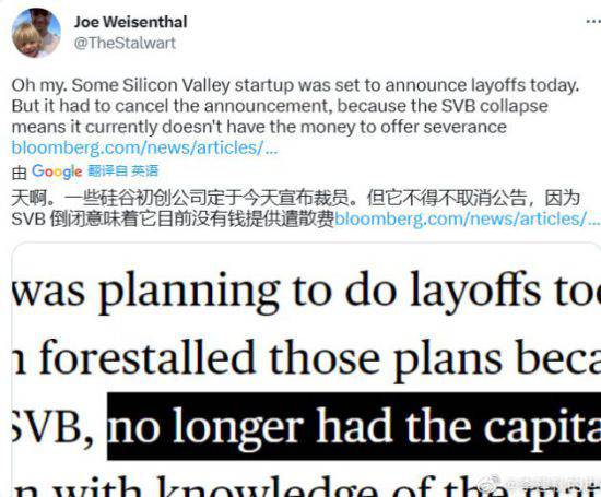 “一些硅谷初创公司定于今天裁员,但是不得不取消公告,因为硅谷银行倒闭意味着它目前没有钱提供遣散费”