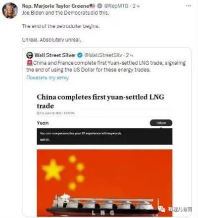 3月29日,提议将美国分为“红色”共和党州和“蓝色”民主党州的美国共和党众议员格林又火了。她发推表示,中法达成首单液化天然气人民币结算交易,拜登和民主党人做到了石油美元终结的开始。