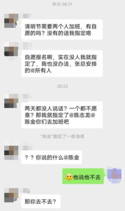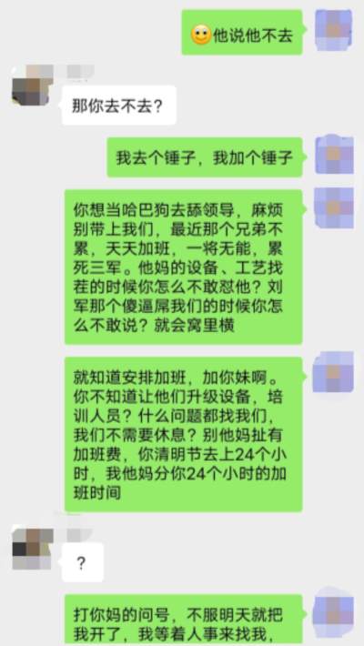 这个聊天记录很多,我相信大伙已经在各个微信群里已经看到过了,网上也多的很。简而言之就是小领导让底层员工清明节还要来加班,然后这就成了“萨拉热窝一声枪响”,把1位名曰“龙哥”的打工人给惹毛了,竖起反旗,硬刚傻逼领导。