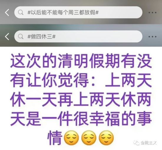 陈志龙事件真相出炉的同时,#做四休三#的话题也随即冲上了热搜,加之此前直接“爆”了的#以后能不能每个周三都放假#,当代中国工人阶级的心诉无需重言烂语。