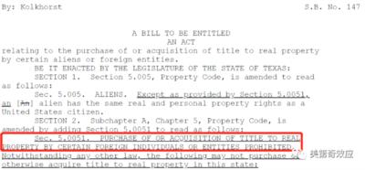 最先提出的是SB147法案,这个法案明令禁止持有美国永久居留权或工作签证的中国人或中国留学生,在德州购买任何地产。