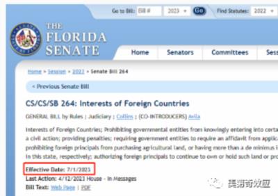 这个SB264法案比德州的法案规定更细,手段更狠。这个法案规定,在2023年7月1日之后,任何中国人(美国公民或绿卡持有者暂时豁免)不可以购买和过户接受任何佛州房地产。如果是因债务转让、法院判决等获得的房产(抵账房产),必须需要在两年内变卖。