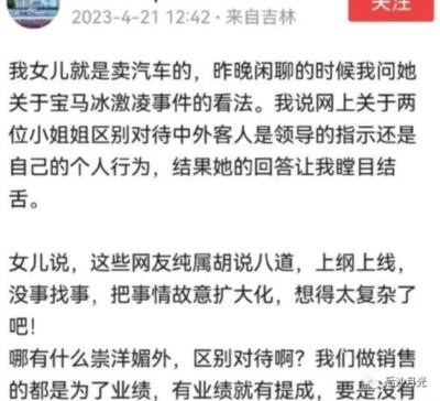 “宝马员工讨好外国人只是一面,另一面就是看不起中国人。”