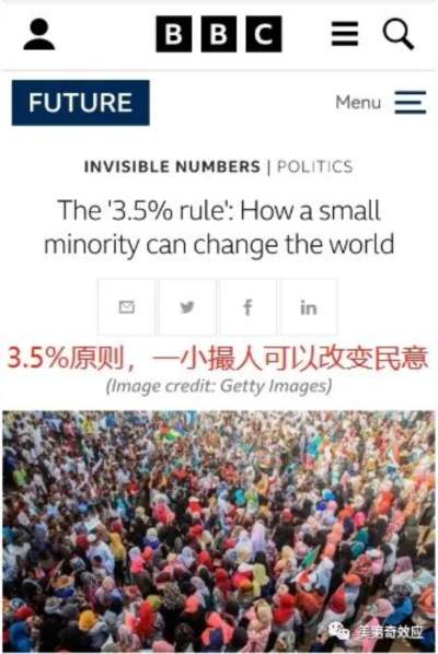 哈佛大学政治学家切诺韦思发现,当有超过人口3.5%的民众参与时,就能推动“变天”。乌克兰2014年天鹅绒政变,阿拉伯之春,甚至乱港,其实真正的反对派并没有很多,但当他们的人数增长到3.5%的时候,通过前文说的私刑和扩大化,通过对新闻舆论的渗透,他们就能够裹挟足够多的中间派,形成不可逆的潮流。