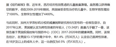 美国像加州这样的民主党地盘已经出台法案,规定为了确保跨性别未成年人能够获得足够的“确认性别医疗保障”,可以将其从父母或法定监护人身边带离,以保证该未成年人使用青春期阻滞剂和跨性别激素。而学校甚至会主动的在家长不知情的情况下对未成年人进行跨性别认知教育。
