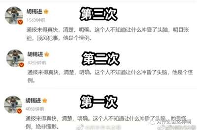 大家注意看,两篇微博时隔仅仅几个小时,在这几个小时之内,胡锡进之前试图轻描淡写大事化小的企图被现实打了脸之后,马上摸着自己的脸不服气的说,他只是个”怪例“,这是什么意思呢?就是为自己开脱的死鸭子嘴硬的说法而已,想说明这种有点权势的人搞小三是”怪例“,是奇怪现象,因为太奇怪,所以他胡锡进强调并造出一个词”怪例“,因为他还算留着最后的一层纸皮脸不敢说这种现象是个例!