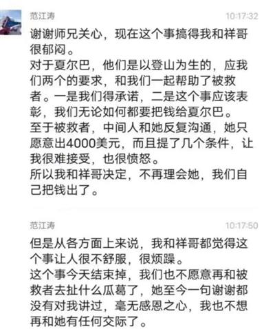 截图的内容很快得到了证实,范江涛在接受采访的时候表示:“我们每人给夏尔巴的小费1800美元,她愿意付1500美元。然后救援费用1万美元,她愿意付4000美元。这把我惹怒了,我说你这样子说的话,这钱我一分都不要了,不用给我了。”