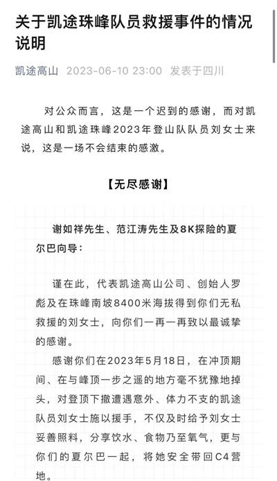 而在舆论爆发之后,刘女士也已经赶到长沙向两位救援者当面表达感谢,其参团的登山公司表示将会承担所有的救援费用,“本次产生的救援费用与物资应由凯途高山承担;目前救援物资已归还、相关经费已支付;其他事项已协调解决”。