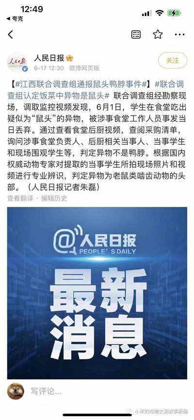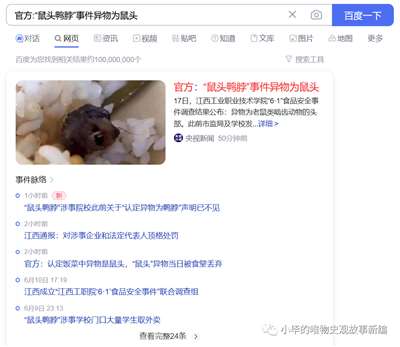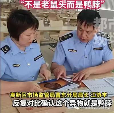 一个非常简单的辩别题,任何一个年龄大于三岁,吃过鸭脖并且掌握最基本的生活常识的人,都不会把那团黑糊糊的东西鉴定成鸭脖,可笑的是,偌大的学校从做饭一直到被学生吃出来,再到送检,如此长的流程里,敢对这团“鸭脖”发出质疑的,竟然只有其中最没有话语权的学生,也是其中唯一可能被老鼠头毒害的一个环节,一件事情败露,数十个应该为此阐明真相的部门,竟然惊人一致的选择了欺骗,这是何等的令人气愤!