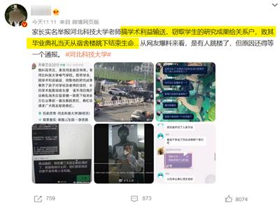 有大v也收到了曝料,说老师搞学术利益输送,把某男学生的研究成果给到了一名关系户女学生,导致男学生不服毕业典礼当天从宿舍楼上一跃而下。