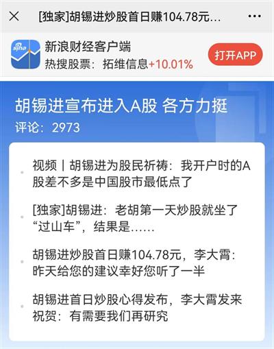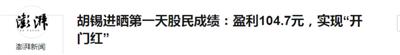 所以,胡先生的表现立即得到了众多媒体的热捧好评----《胡锡进为股民祈祷:我开户时的A股差不多是中国股市最低点了》、《胡锡进晒第一天股民成绩:盈利104.7元,实现“开门红”》。