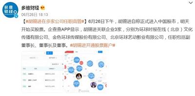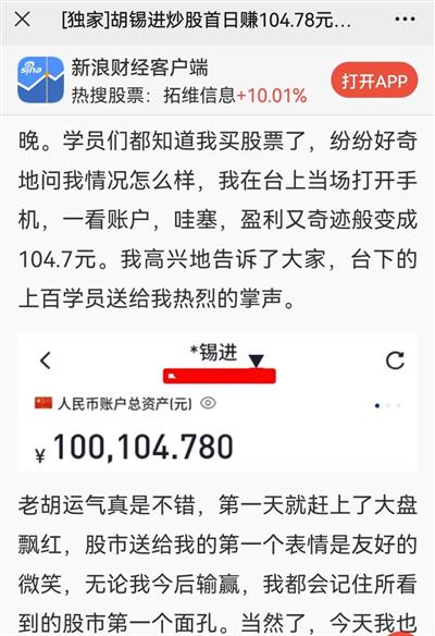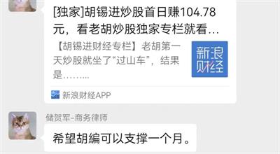 胡锡进首入股市,首日赚了104.78元。6月27日当天,《环球时报》前总编辑胡锡进先生在其个人微博上不无得意地炫了炫。