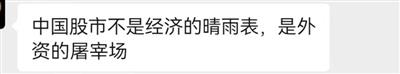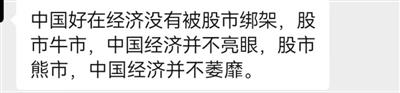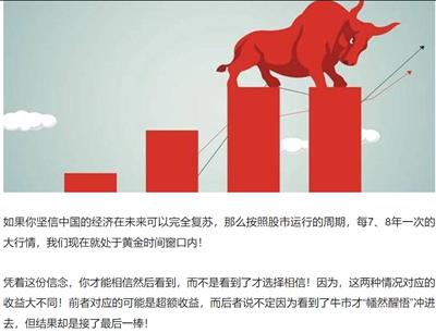 一是“说股市变幻莫测,没错,但好像也不是毫无可预测性。”二是“我为自己也为股民们祈祷:昨天我开户时的A股股指就差不多是中国股市从今往后的最低点了。”三是“我这个时候进入,除了想对中国经济增加一份切身感知,也是觉得股市都跌这么多了,国家更多振兴经济的措施都说已经在路上了,所以我有此时进入大概率不会赔的‘初生牛犊不怕虎’。我可不想赔个底掉,呲牙咧嘴地感受做‘韭菜’的痛。”尤其是这第三条,明显地往政府方面靠,暗示有政府背景、为政府行为,这个诱惑力、杀伤力十分强大。确实诱惑了一些人。