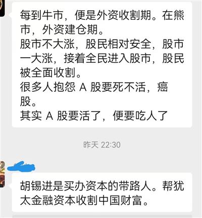 我留心了近几天网上的反应,询问了周围百姓的看法,朋友们告诉我的话是真的。无数网民迅速地行动起来,揭露胡锡进们的企图、剖析他们的路径,警醒居民网民。而绝大多数的民众对胡的诱惑嗤之以鼻,对股市的涨跌无动于衷。看来,这次他们的诱惑煽动难以有效,中国老百姓的羊毛这次并不好薅。这令我多少有些欣慰,有些安心。