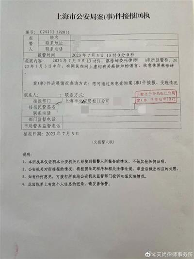 “天尚律师事务所”贴出了一张上海市公安局案(事件)接报回执。