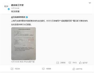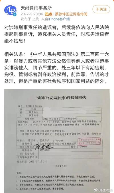 晚上18时08分,蔡徐坤委托的“天尚律师事务所”即发布通报,称上海天尚律师事务所接受蔡徐坤先生的委托,针对今日微博用户“超能摄影阳阳”“懂瓜呱”对蔡徐坤先生的造谣诽谤行为已报警。