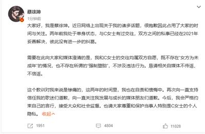 昨天,身陷逼C女士堕胎危机多日的流量明星蔡徐坤,终于回应了。不过这个回应和之前那些社死的明星一个调性,说是道歉,其实全无悔意,反而想尽办法为自己开脱,说的他好像才是被害人一样。
