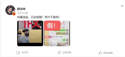 蔡徐坤这次回应超级快,发帖声称“照片不是我”、“纯属造谣”,并声称“已去报警”。