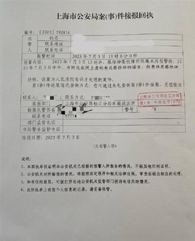 具体是哪个派出所,“天尚律师事务所”给码掉了,只能看出是松江公安分局的一个派出所。不过,“天尚律师事务所”不久发了另一个帖子,贴出了有更详细信息的回执,上面显示是松江分局车墩派出所。