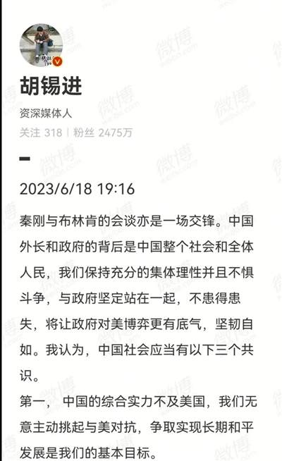 然而,就在2023年6月18日美国国务卿布林肯访华的事件中,胡锡进彻底暴露了他投降派的真面目。