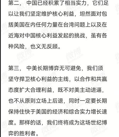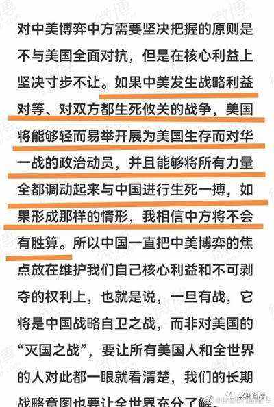 “如果中美发生战略利益对等、对双方都生死攸关的战争,美国将能够轻而易举开展为美国生存而对华一战的政治动员,并且能够将所有力量全都调动起来与中国进行生死一搏,如果形成那样的情形, 我相信中方将不会有胜算。”