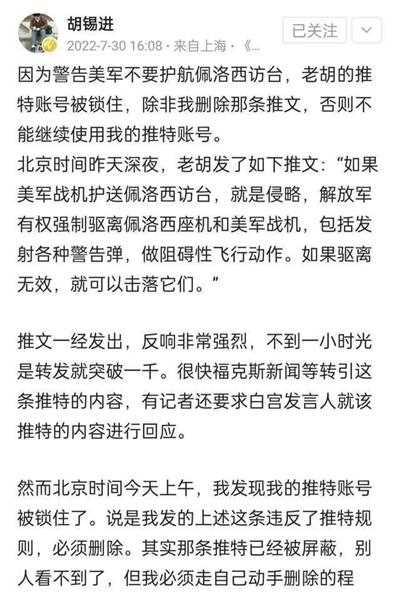 胡锡进认为中国面对美国讲全无胜算,那么为何你2022年鼓吹击落佩洛西专机,并鼓吹不惜一战?