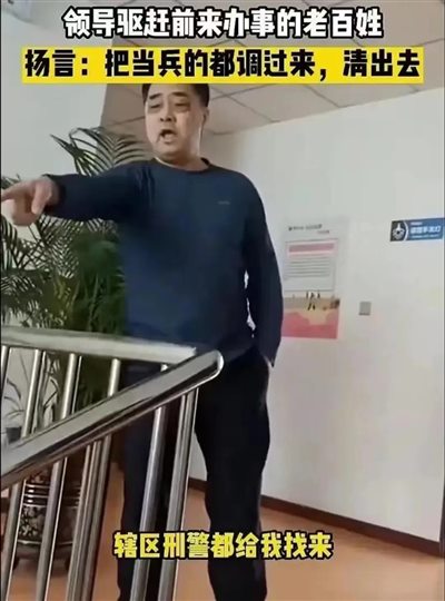 据知情者称,事发当天上午,有几十名居民来到该单位一楼大厅反映他们所在小区的物业管理问题,要求该单位给予协调和解决。估计是一楼的嘈杂声吵到了这位正在二楼打瞌睡的 “熊猫眼”领导,他便在二楼一手插兜,一手指着楼下的人命令下属:“去!把辖区警察都给我找来,把当兵的都调过来,清出去!”当群众解释是过来解决问题的,"熊猫眼"愈发盛气凌人,咆哮道:"我这里有解决问题的地方吗?"