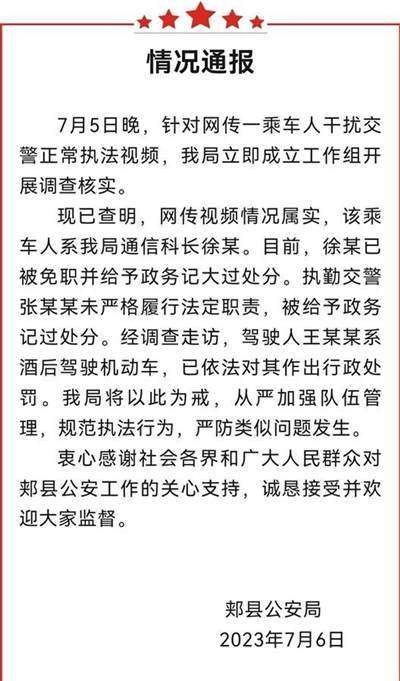 而根据平安郏县警方发布的警情通报,该车辆上的后排男子确实是当地公安局通信科长,目前的处理结果是“免职”+记大过。
