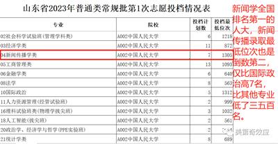比如新闻学全国排名第一的人大,新闻传播录取最低位次去年是全省700名左右,今年一下跌到了1305名,位列所有专业中倒数第二,仅比国际政治高7名,比其他专业低3-500名不等。