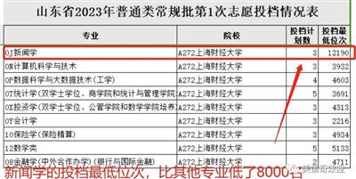 另一个招录新闻学的211大学,上海财经大学,新闻学最低投档位次跌到了12190名,而其他专业大都在2000-4000名的区间,新闻学不但倒数,位次也从211大学的档次,跌到了普通一本的档次。