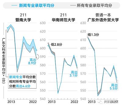 在2023年之前,新闻传播专业的分数线还是挺高的。比如在广东的一份调查显示,新闻专业的录取分数在22年之前比所有专业平均分高出3.1分到8.9分。算是文科专业中分数较高的。