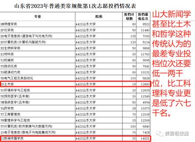 山东大学作为山东考生的热门大学,2022年新闻传播学类的投档最低位次为7907,在整个山大文科中排名中上;而到了2023年新闻传播学类的投档最低位次就下探到了14321,成了仅比外语类和公管类略好的倒数第三名。甚至比哲学和土木这些传统意义上的就业老大难专业录取位次更低。