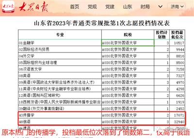 然而2023年现在已经披露的数据显示,新闻传播的录取位次极大的跳水。根据大众日报引述山东教育招生考试院公布的普通类常规批次第一志愿投档情况表,新闻传播专业的录取位次基本在各校中都是垫底。