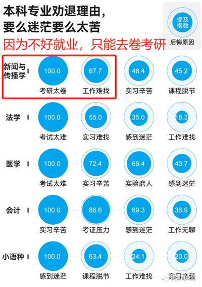 在一个本科专业“劝退”的调查中,新闻专业的学生最后悔的原因第一是考研太卷,第二是不好找工作。