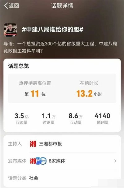 看完各方面的报道后,我觉得目前的新闻报道均没有反应事实真相,不管是官媒还是自媒体均是如此,我觉得哪怕是官媒都没有仔细认真的采访基建行业的相关专家,随便找个人问几句话就急匆匆的发报道了,所以写出来的东西问题很大,离真相偏差相当之远。
