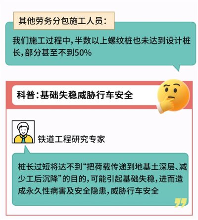 但记者采访的铁道工程专家称,桩基础不足将会引发高铁永久性病害和安全隐患,威胁行车安全。