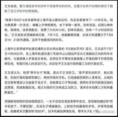 王先生说:“我从事件开始直到被拘留,从来没有发现或意识到对方为精神病患者”,“审讯时我没有说过出于炫耀的目的”,“我首次发布视频未经剪辑与删除”;这三点和上海公安说的“王某交代,拍摄时已感觉尹某精神异常,出于吸粉和自我炫耀目的,将视频剪辑后上网,以引起关注”直接矛盾。