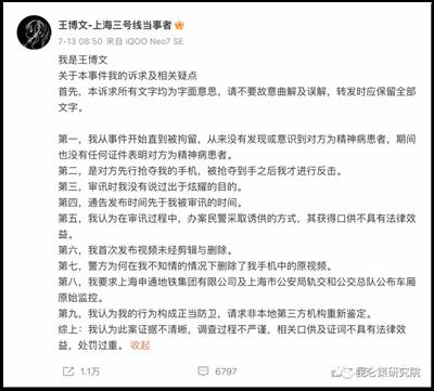 按照王先生的说法,他到14:30左右还没开始接受审讯,然而@轨交幺幺零 在14:21就发布了通告,如果王先生的叙述属实,这就相当于指控上海警方“未审先判”。