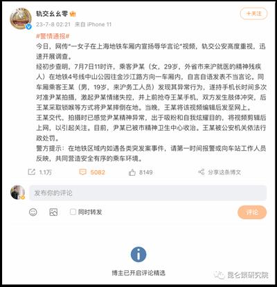 8日14:21,上海公安@轨交幺幺零 发布了一则“警情通报”称:“自言自语发表不当言论”的女子系“外省市来沪就医的精神残疾人”;王先生拍视频的做法“激起尹某情绪失控,并上前抢夺王某手机”;“王某交代,拍摄时已感觉尹某精神异常,出于吸粉和自我炫耀目的,将视频剪辑后上网,以引起关注”。