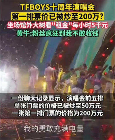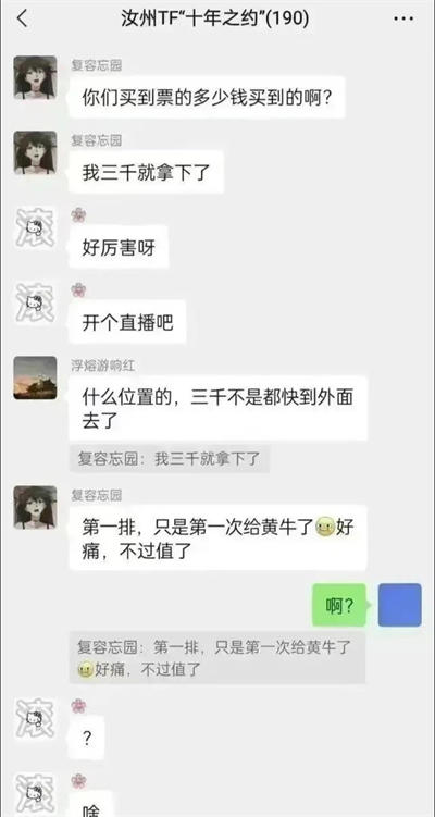 有个女生在微信群里显摆,说她花三千元就拿下了一张门票,还说门票是第一排的,是把自己的第一次给了黄牛的。