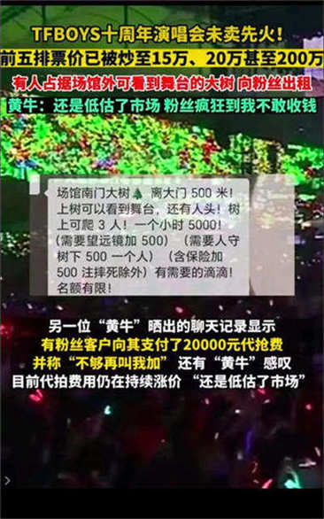 有个女生因为买不到门票,只好租赁演唱会场馆外大树上的一个位置,租金每小时5000元。
