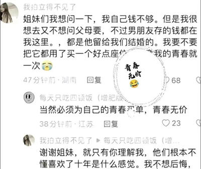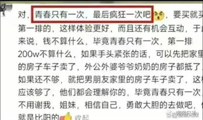 有个女生在朋友圈呼吁自己的姐妹要买就买第一排,200万不算什么,钱不够可以先把家里的房子车子卖了、爷爷奶奶外公外婆的房子都抵了,还不够的话,就把男朋友家的房子车子卖了,只为更好体验和互动。