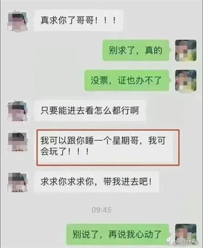有个女生买不到门票找到黄牛党,表示只要黄牛能想办法让她进场,她愿意跟黄牛共度一周。