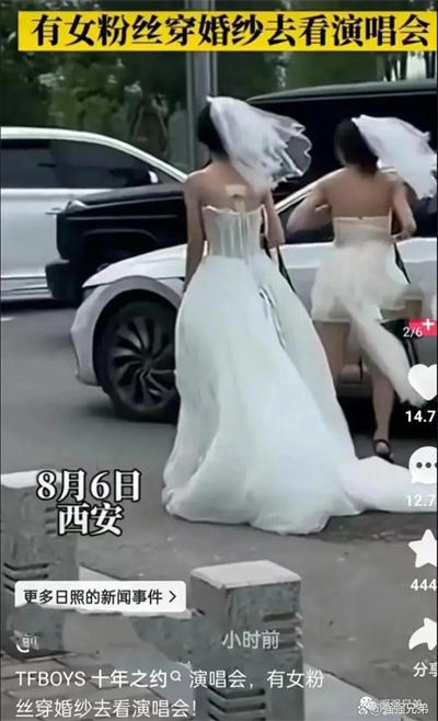 有个女生在自己大喜的日子,从正在举行的婚礼现场转身离开,直接穿着婚纱向西安演唱会奔去。