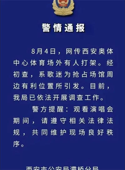 成千上万的人涌向西安奥体中心体育场,为了给各自偶像呐喊助威,他们在地铁大声喧哗,在街头挥舞旗帜;他们互相辱骂,带刀群殴;他们袭击保安,威胁警察,冲击安检……