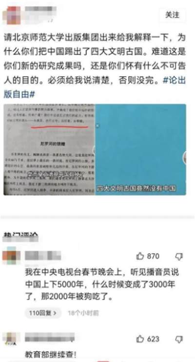 事件的起因,是有网友爆料和投诉,北师大出版社出版的历史图书《世界上下五千年》里,将中国“踢出四大文明古国”行列,众多网友声讨,引发了媒体的跟进采访。