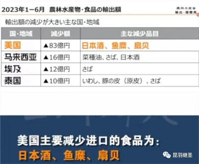 日本农林水产省的数据显示的非常清楚,美国是上半年减少进口日本农林水产最多的国家,其主要减少的食品有三种,分别是日本酒、鱼糜、扇贝,这三种食品的主要产地均位于核污染水排放的影响区域。