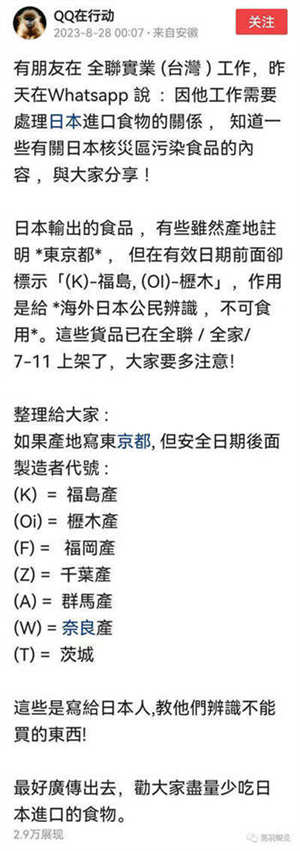 小日本也很坏,一边撒狗粮,让残次狗出来为自己洗地,一边宣称自己排放的核污染水符合“国际标准”,转头就琢磨起如何在食品包装上做些小心思,以提醒自己的海外国民。有在全联实业(台湾)公司工作的网友爆料,小日本对外出口的某些食品,产地虽然标注的是“东京都”字样,但为了区分和提示,又在产品的有效日期前加了一个字母代码的标识,例如,K代表福岛,Oi代表櫪木县,F代表福冈,Z代表千叶县,A代表群马,W代表奈良,T代表茨城。这些日本食品已经在全联、全家、7-11上架,实际都是产自核辐射区,都不宜购买食用。